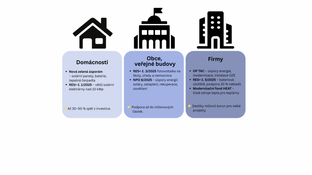 Největší šanci mají majitelé rodinných domů. Stále běží Nová zelená úsporám, kde stát přispívá na solární elektrárnu, baterii nebo tepelné čerpadlo. Nově tu je i program RES+, vhodný pro větší instalace nad 10 kWp.